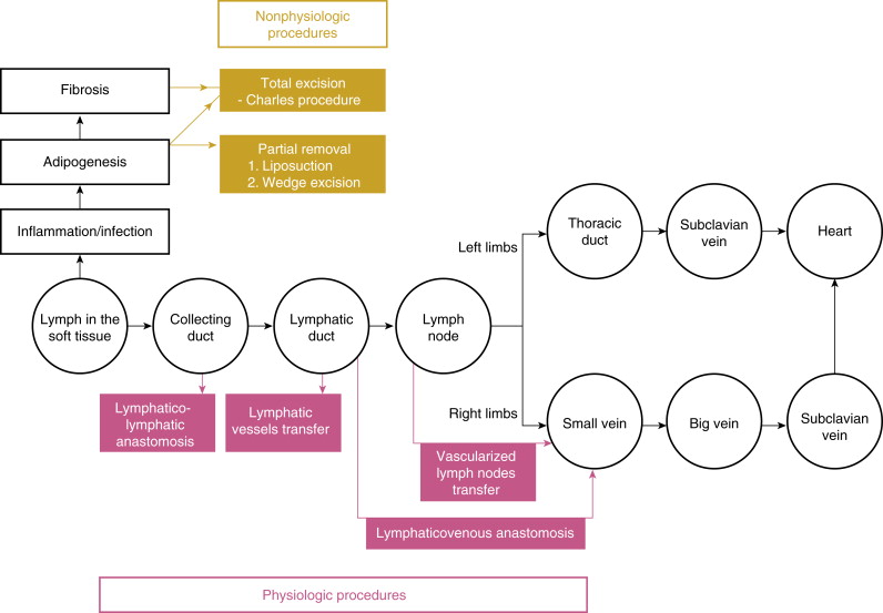 From this schematic, one can learn the physiology of these surgical procedures, and choose the right procedure for the appropriate patient, with the ability to have an effective outcome. Nonphysiologic procedures may decrease the lymphatic fluid production load and remove byproducts of excess lymph fluid, but likely require lifetime compression garments to prevent recurrence of lymphedema and excess limb volume. In correctly selected patients, physiologic procedures may allow for the elimination of compression garments, which has a significant impact on quality of life. As the specialty continues to define surgical success, factors outside of limb circumference changes will become increasingly important to recognize. The overall goal of all lymphedema surgical procedures is to improve patient functionality and quality of life. Patient-reported outcome measures may have a greater impact on the definition of surgical success. Development of a comprehensive and multifactorial outcomes assessment method will not only allow individual physicians to define success in their individual practice, but will create a common language between specialties to facilitate improvements in multidisciplinary patient care delivery.