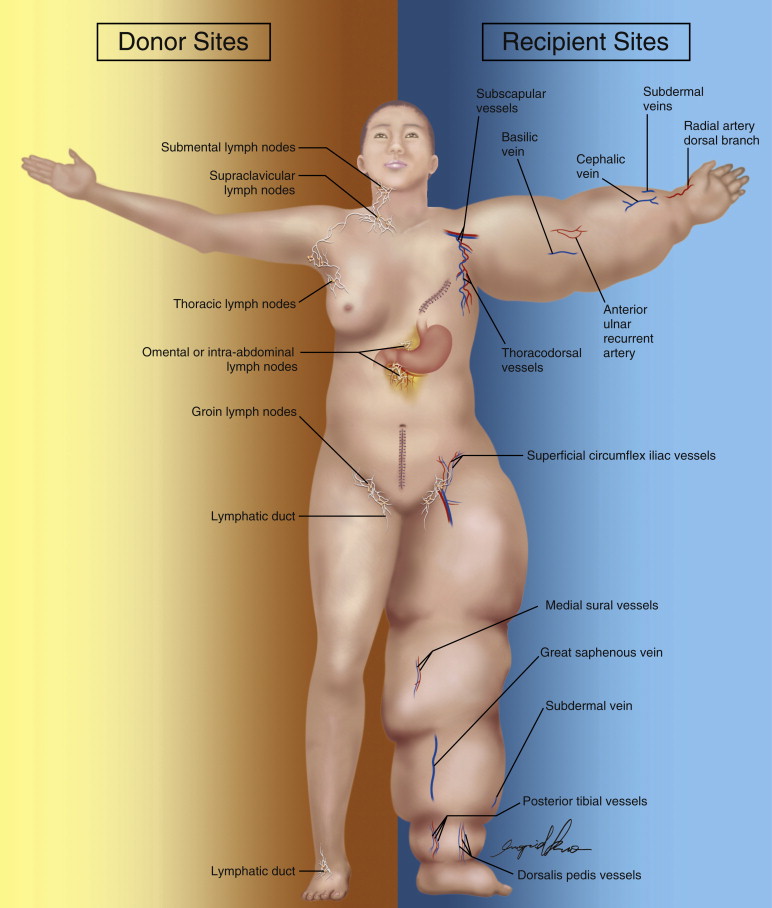 The available evidence-based surgical treatment options are summarized in Figure 24.3 . The right body half represents available donor sites and the left body half shows available recipient sites for microsurgical procedures. As our understanding of lymph node basins and physiologic processes related to these procedures expand, increasing options will become available. More studies and improved methodologies regarding donor site morbidity and the indications and outcomes of various lymph node transplantation procedures are mandatory. Recipient sites for both microsurgical procedures are outlined as well. The functional subdermal venules are most available in the forearm and wrist close to the cephalic vein in the upper limb, or on the leg and ankle close to the great saphenous vein in the lower limb for LVA. And, experience has shown that there are variable recipient sites available for VLN transfer on the lymphedematous limb. Combined procedures in lymphatic microsurgery have also been introduced as an effective way to provide maximal patient benefit in fewer surgeries. Although adding layers of complexity to these surgeries, less recurring operative morbidity may result in higher quality of life and increased functional recovery. Further critical evaluation of these techniques will shed light on to their effectiveness.