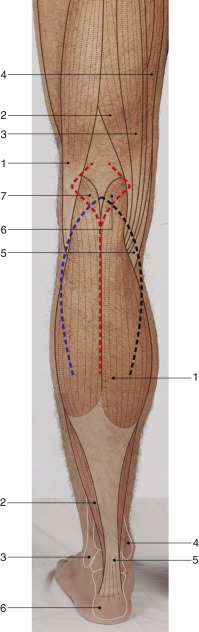 A transverse line is marked in the posterior knee crease; this coincides with the level of the takeoff of the medial and lateral sural vessels. The midline raphe separating the medial and lateral heads and the distal ends of the muscles are marked. These landmarks can be palpated in most patients.
