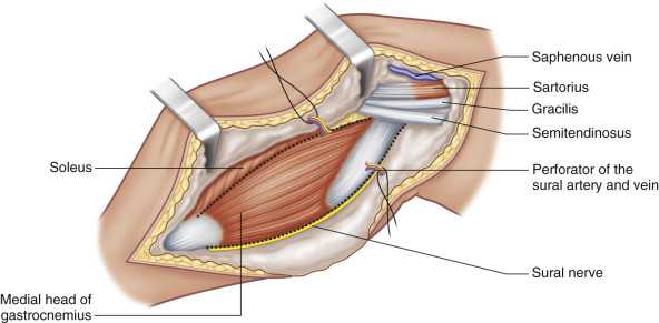 Many of the branches off the sural artery, supplying the overlying skin, exist in the distal medial half of the muscle bellies. Therefore, when harvesting an overlying skin island, it is preferable to design the island to include this region.