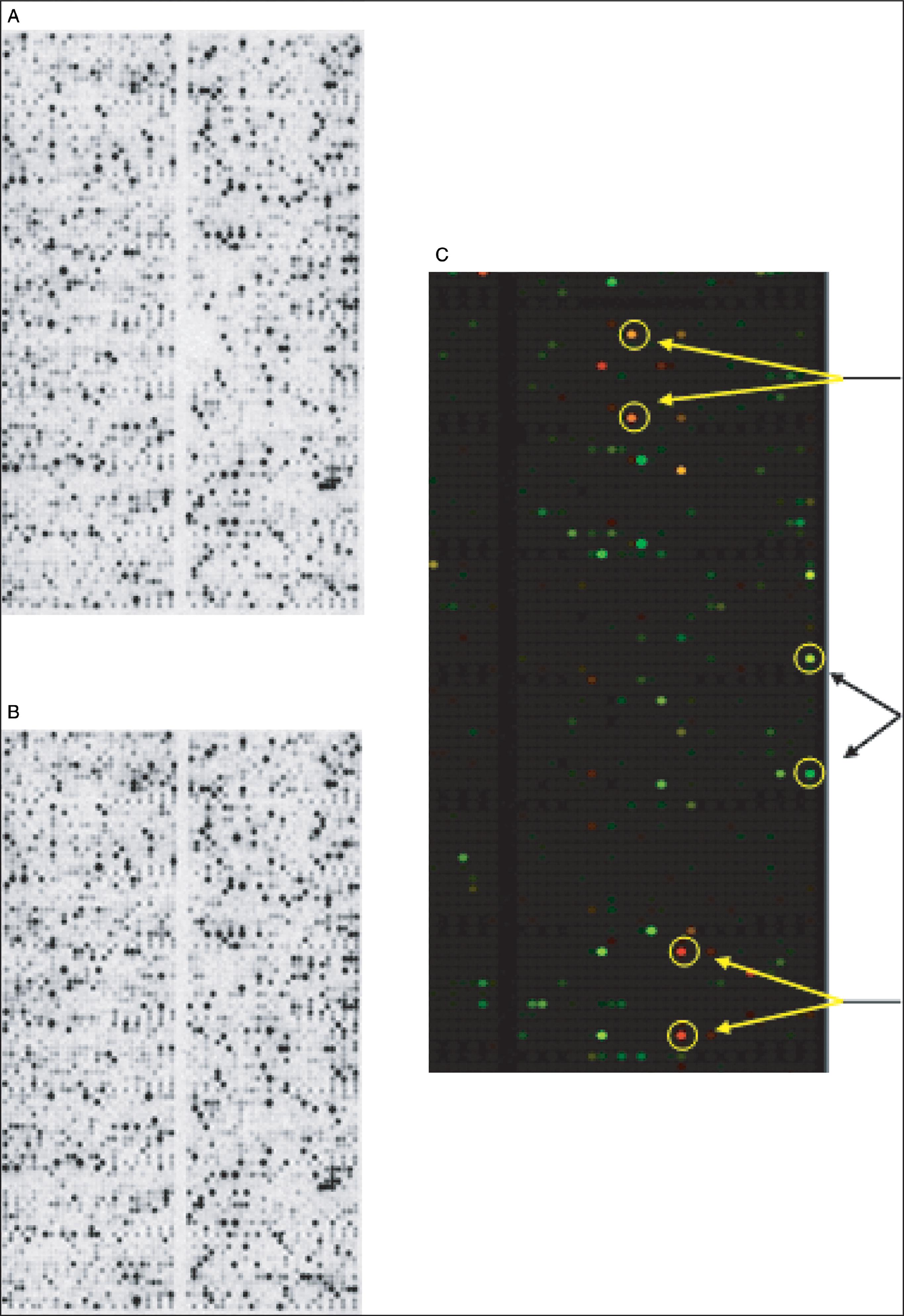 We have used gene array technology to identify unique compounds that have antiaging and/or antiinflammatory effects in multiple skin cell types. In one study we assessed the ability of a novel nitrone spin-trap compound to modulate the expression of aging-related genes in older human dermal fibroblasts. The fibroblasts were grown in the presence (experimental) or absence (control) of the spin-trap nitrone compound CX-412 for 48 hours, at which time the mRNA from each cell culture group was isolated, converted to a cDNA, labeled with radioactive nucleotides, and hybridized to IntegriDerm DermArray gene filters. These microarray filters contain over 4400 unique cDNAs specifically chosen due to their expression in skin cells and relevance to dermatologic research. Genes that are commonly expressed in skin are spotted in duplicate at different sites on the gene filters to provide an estimate of reproducibility of the hybridization reaction. The hybridization images are imported into a computer program that normalizes the data set and provides a color-coded picture of which expressed genes in the CX-412–treated fibroblasts were upregulated (coded in green) or downregulated (coded in red) relative to the untreated fibroblast cultures ( Fig. 18.2C ). Figs. 18.2A and B show the actual filter images of the hybridized radioactive cDNAs that were upregulated or downregulated by the CX-412 compound.