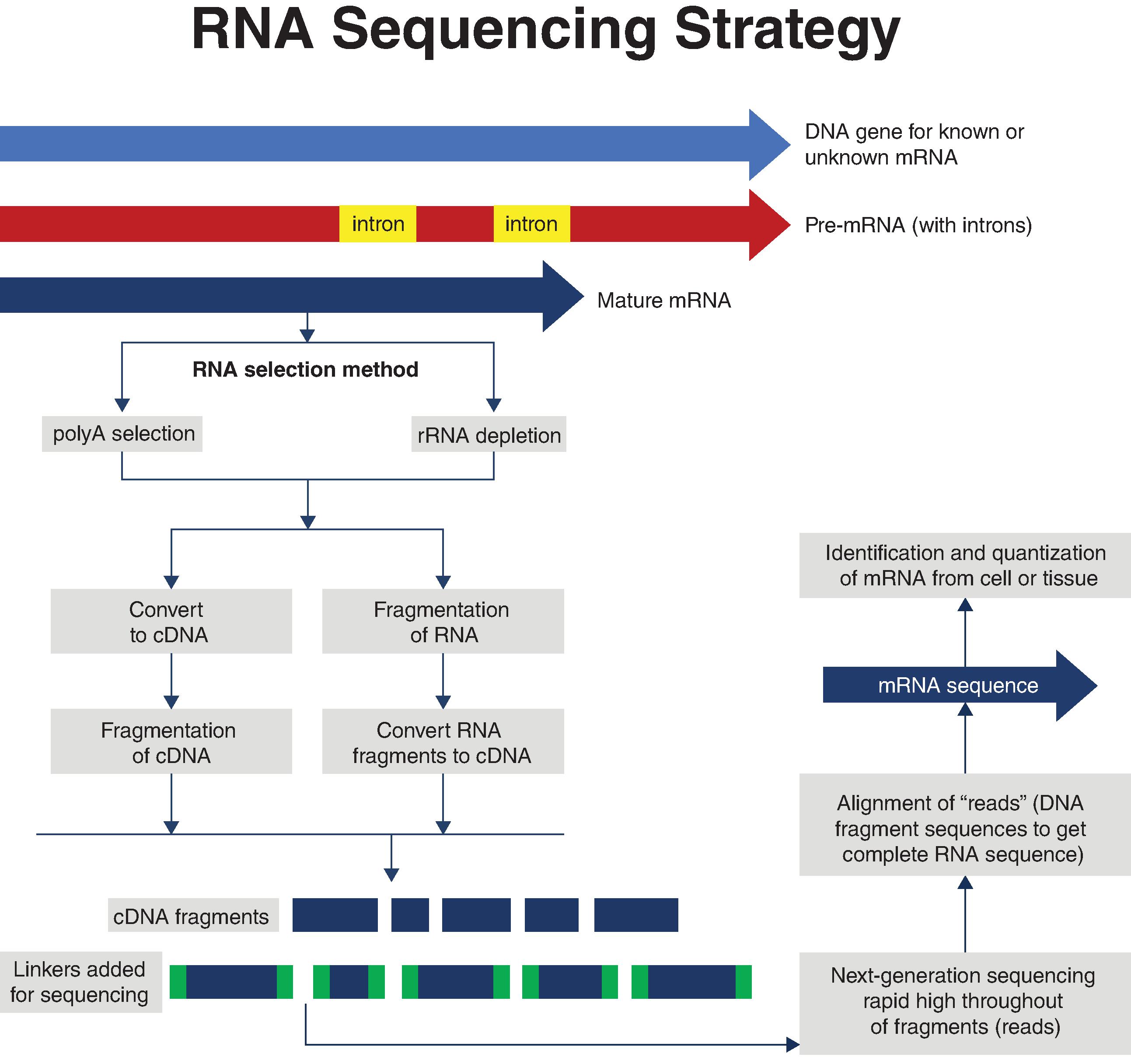 As shown in Fig. 18.3 , the steps involved in RNA sequencing are (1) isolating mRNA, (2) converting RNA to cDNA, (3) fragmenting the cDNA into smaller segments needed for sequencing, (4) sequencing the DNA sequences using NGS methods such as Illumina sequencing, and (5) aligning the DNA sequence “reads” to obtain the entire sequence. This method can be applied to identifying novel unknown RNAs as well as known mRNAs in tissues and even single cells. As was the case for gene array analysis, the first step of isolating RNA from the cells of interest typically involves isolating mRNAs that contain 3′polyadenylated (polyA) tails. However, this isn’t the only option. Since there are some mRNAs (e.g., histone mRNA) and other types of RNA that do not have polyA tails, if only polyadenylated mRNAs are isolated, it is possible that some unknown mRNAs that may be important for cell functioning are not being recovered. To circumvent this, total RNA can be prepared and then processed to remove ribosomal RNA. Once either polyadenylated mRNA or rRNA-depleted RNA is prepared, the RNA can then either be (1) fragmented into smaller segments that are then reverse transcribed to cDNA, or more frequently, (2) reverse transcribed into cDNA that is then fragmented. Regardless of which approach is used, the preparation of small cDNA fragments of between 30 and 400 base pairs is necessary for the subsequent rapid, high-throughput sequencing steps. As shown in Fig. 18.3 , prior to DNA sequencing, adapter “linkers” are added to the cDNA fragments. These adapters allow the cDNA fragments to bind to complementary oligonucleotides that have been bound to the flow cell matrix (or another matrix, depending on the system used) where DNA synthesis and sequencing will occur. The actual steps involved in NGS-based high-throughput RNA sequencing of the bound cDNA fragments vary depending on the particular methodology being used. One of the most widely used methodologies is the reversible dye terminator method used by Illumina. The first step in this method is to prepare thousands of copies of each cDNA fragment that are then bound to the oligonucleotides on the flow cell matrix (“chip”). The thousands of identical copies of each cDNA are referred to as a cluster . The next step involves the use of nucleotides, where each nucleotide has a unique fluorescent dye blocker that only allows DNA polymerase to add one nucleotide at each cycle to the cDNA fragment template bound to the flow cell matrix. The addition of this blocker nucleotide halts the synthesis. After each round of synthesis, the fluorescent dye that was added is recorded, and because each nucleotide has a different dye with a unique fluorescent signature, the computer can tell which nucleotide was added. After the camera records the fluorescent signature of the nucleotide, a chemical de-blocking agent is added to remove the blocking group, and the polymerase reaction then proceeds to add another fluorescently labeled nucleotide, which then stops the reaction again. The newly added fluorescently tagged nucleotide is identified, the blocking dye removed, and the synthesis step reinitiated. This continues until the entire DNA fragment has been sequenced. A sequenced fragment of the cDNA bound to the matrix is known as a read . The sequencing event occurs for millions of clusters at once, and given that each cluster has about 1000 identical copies of a cDNA, the speed and efficiency of this procedure are remarkable. Once all the fragments bound to the flow cell matrix have been sequenced, the fragments must be aligned through their overlapping sequences to obtain the full-length RNA sequence. A more complete review of this type of high-throughput NGS methodology can be found in several reviews.