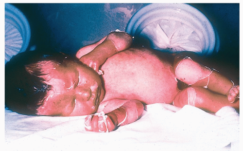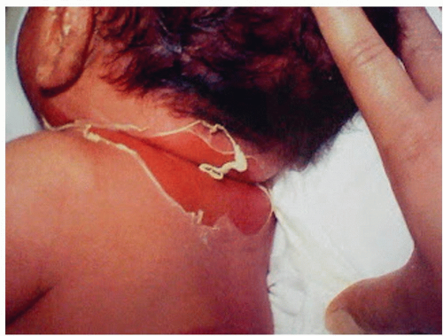 SSSS presents as an erythematous rash followed by diffuse epidermal exfoliation characterized by the appearance of large fluid-filled flaccid bullae that rupture easily, leaving an area that looks like a burn (Figs. 20-1 and 20-2).