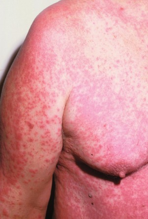 Drug eruption – bright red macules and papules confluent in large areas.
