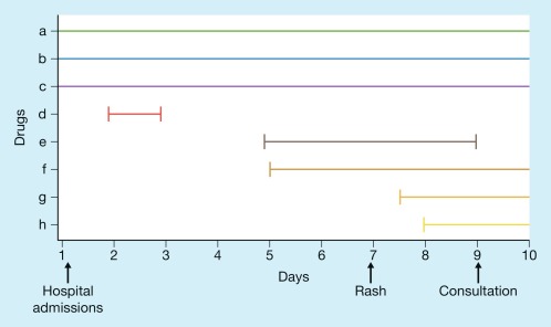 Graphic depiction of drug history (see text for discussion of drugs “a–h”).