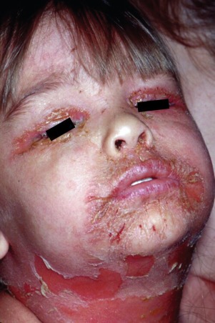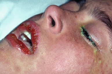 Steven-Johnson syndrome – note erythema and involvement of two mucosal surfaces – hemorrhagic lips and conjunctiva.