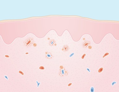 Epidermis – normal. Dermis – superficial and deep perivascular inflammatory cell infiltrate that includes eosinophils.