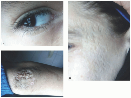 FIGURE 10-1. Lipoid proteinosis. A, Beaded, waxy papules along the eyelid margins. B and C, Characteristic, atrophic, varioliform scarring on the face and elbows.
