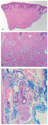 There is deposition of pale, eosinophilic, amorphous material surrounding small capillaries and eccrine ducts in the superficial dermis. In more developed lesions, deposits undergo hyaline thickening with an “onion-skin” appearance. Sweat glands are damaged with increased hyaline deposition (Figure 10-2). Hyperkeratosis and papillomatous may be seen.6 The hyaline deposits are periodic acid-Schiff (PAS) positive and diastase resistant, and stain with Alcian blue as well as Sudan black on frozen sections.7