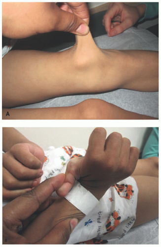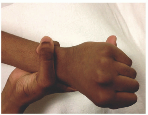 ![]() FIGURE 9-2. Marfan syndrome. Long fingers result in the thumb sign, in which the thumb protrudes from a closed fist, and the wrist sign, in which the thumb and fifth finger overlap when encircling the opposite wrist. Reprinted with permission from Bitterman AD, Sponseller PD. Marfan syndrome: a clinical update. J Am Acad Orthop Surg. 2017;25(9):603-609, Figure 2. |