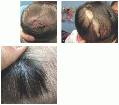 underlying bone and meninges are not uncommon. There is no single cause of ACC, which can be categorized on the basis of the number and location of lesions and associated clinical features (Table 9-4). The estimated incidence of ACC is approximately 3 in 10 000 births with a predominance in females.48,49