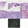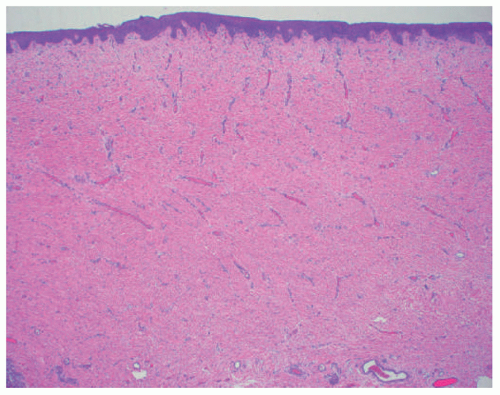 ![]() FIGURE 9-5. Aplasia cutis congenital. Thin epidermis overlies a dermal scar that lacks adnexal structures.