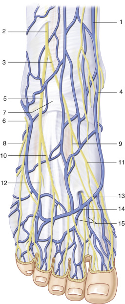 Small veins over the dorsum of the great and second toe coalesce into tributaries that connect to a venous arch on the dorsum of the foot, the completeness of this arch being variable. These veins run in the subcutaneous system just under the dermis and in the fatty tissue above the deep fascia of the foot, superficial to the extensor tendons. The venous arch drains into the dominant saphenous system. Long venous pedicles on any foot flap can be harvested with the saphenous system for a vein of virtually any length necessary. A second deep venous system of small venae comitantes accompanies the proper digital arteries to the toes but is generally too small for microvascular transplantation. If these veins are traced proximal to the posterior tibial artery or dorsalis pedis artery, they are larger and can sometimes be used for microvascular repair. The subcutaneous veins are, however, much larger and more amenable to microsurgical repair in most cases.