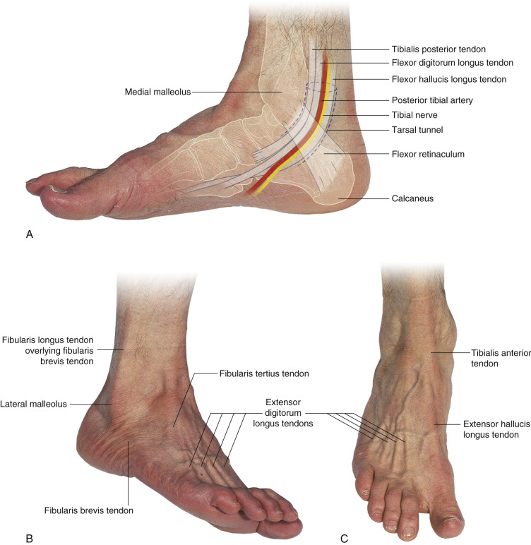 The posterior tibial arterial system enters the foot posterior to the medial malleolus of the tibia in the tarsal tunnel. This artery then bifurcates into medial and lateral plantar arteries, with the medial plantar branch further subdividing into several branches. The lateral plantar branch joins the plantar system at the level of the base of the metatarsal. Multiple common digital arteries branch at this level and travel deep to the metatarsal and eventually join the dorsal metatarsal arterial system just distal to the transverse metatarsal ligament. At this junction, the artery immediately bifurcates, sending terminal digital artery branches both medially and laterally.
