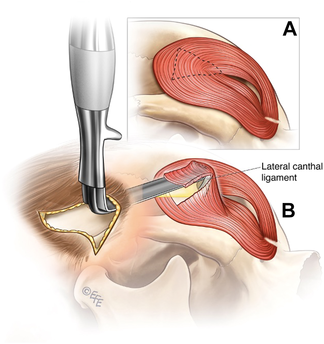 When the procedure approaches the region of the lateral orbit, the intricacies of the anatomy require a nuanced approach. Given the thin skin in this area, the technique modifies the approach slightly; the skin and subcutaneous flap at this point include a portion of the lateral orbicularis muscle. This integration allows for precise identification of the lateral canthal ligament, facilitating manipulation if necessary ( Fig. 2 ).