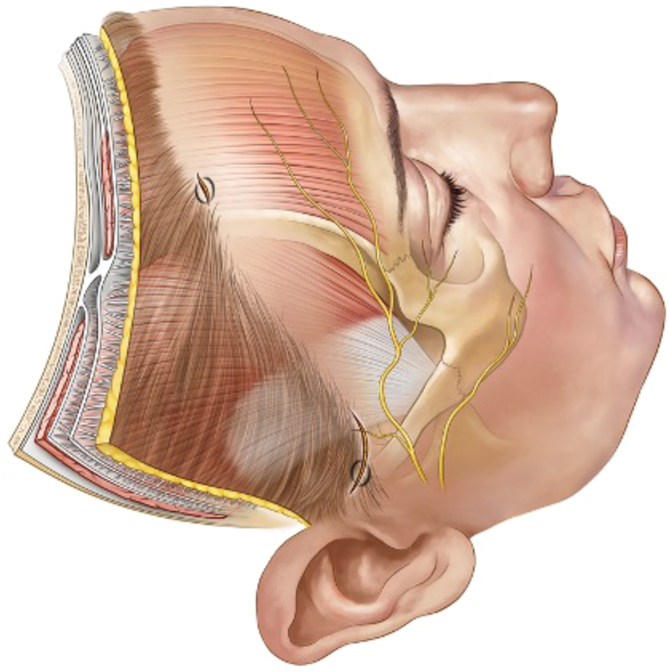 The Glidelift procedure then begins with the creation of two strategically placed access incisions. The first incision is made in the lateral forehead, concealed within the hairline, and the second is positioned just below the hair in the sideburn area (see Fig. 3 ). These incisions serve as gateways for the formation of small tunnels in distinct anatomic planes that are subsequently interconnected. This connection enhances visibility through the minimal incision, permits the repositioning of excess skin in the temporal scalp without excising it, and thereby sets the foundation for the Glidelift.
