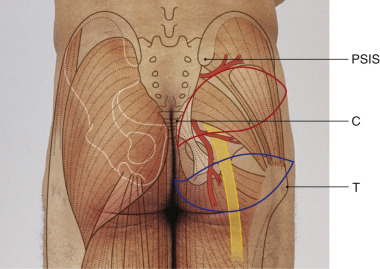 The initial points marked are the posterior superior iliac spine (PSIS), the prominence of the greater trochanter (T) of the femur, the superior edge of the greater trochanter, and the coccyx (C). The location where the SGA exits the suprapiriform foramen is marked on the skin at the proximal one-third of a line connecting the posterior superior iliac spine and the apex of the greater trochanter. Figure 44.2 shows the territories of the superior gluteal and the inferior gluteal flaps and their relationships with the above-mentioned landmarks.