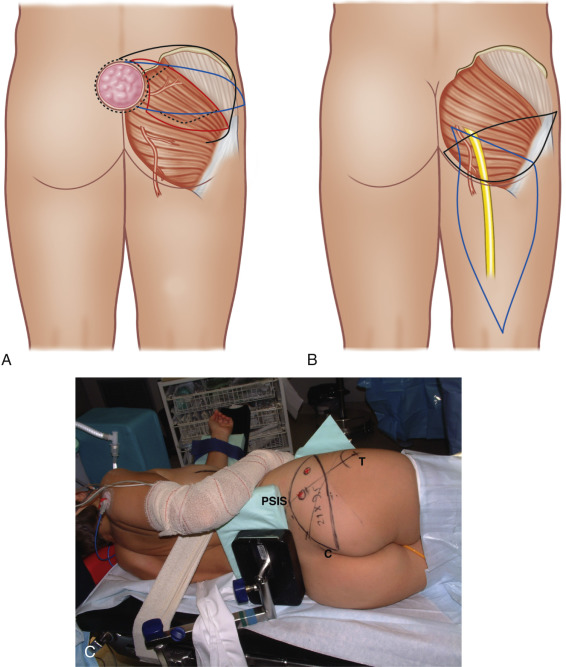 (A) The design of the superior gluteal flap for pressure sores. The flap can be designed as a rotation flap (black line), as an island transposition flap (red line), or as a V-Y advancement (blue line). (B) The design of the inferior gluteal flap as a transposition or V-Y advancement flap (black line); the gluteal thigh flap is marked in blue. (C) Patient positioning during harvesting of an SGAP free flap for breast reconstruction. The dotted lines delineate the area where the main perforators of the SGA can be expected (see text for more details). PSIS, posterior superior iliac spine; C, coccyx; T, greater trochanter.