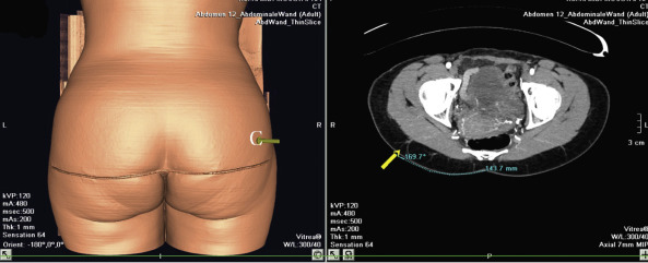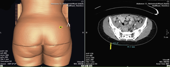 CT angio scan shows clearly the location of the perforator when it raises from the gluteus muscle (A).