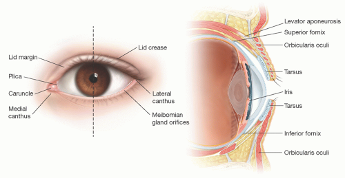 • The upper and lower eyelid meet at the medial and lateral canthus with the lateral canthus sitting 2 to 4 mm higher than the medial (FIG 1).
