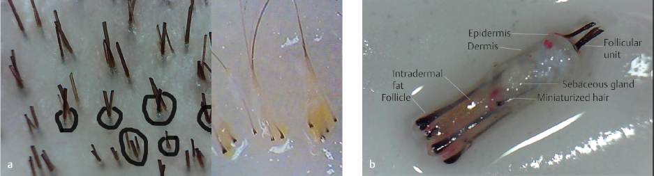Currently, all methods of hair transplantation depend on redistribution of existing “permanent” donor hair, and utilize the naturally occurring “follicular unit” or hair bundles (Fig. 37.1a) to achieve natural results. These are observed to generally contain one to four hairs, though in some patients five- to six-hair bundles can be seen.