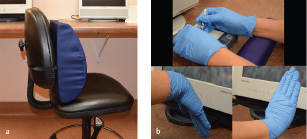 Fig. 37.2 (a) Height adjustable chair with lumbar support. (b) Forearm rest and stretching.
