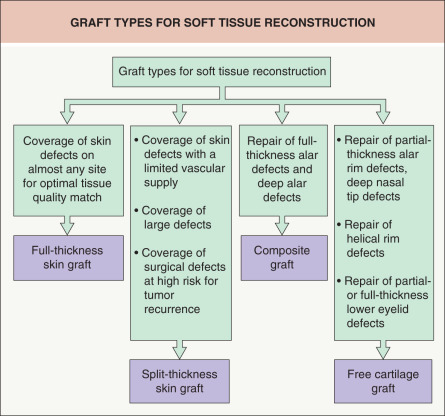 Grafts for soft tissue reconstruction can be divided into four types: full-thickness skin grafts, split-thickness skin grafts, composite grafts, and free cartilage grafts