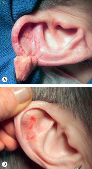 Contouring of donor skin in FTSGs may be challenging, particularly when repairing defects on the nasal tip, ala, lateral nasal sidewall, helical rim of the ear, and eyelid . Graft contouring often requires multiple trial placements within the recipient bed, as well as multiple trimmings, to obtain an optimal result. Removal of cartilage not needed for structural support may increase the chance of graft survival, particularly for auricular defects, without compromising the aesthetic appearance of the repair .