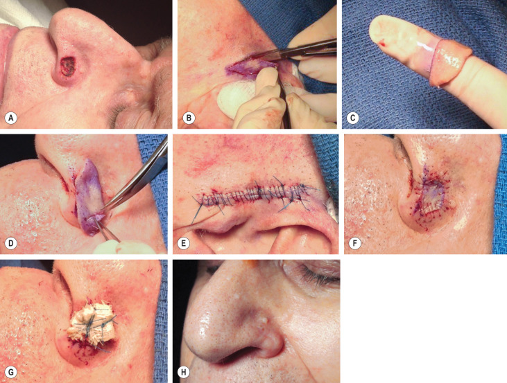 | Junction of nasal dorsum/tip | Burow’s graft |
