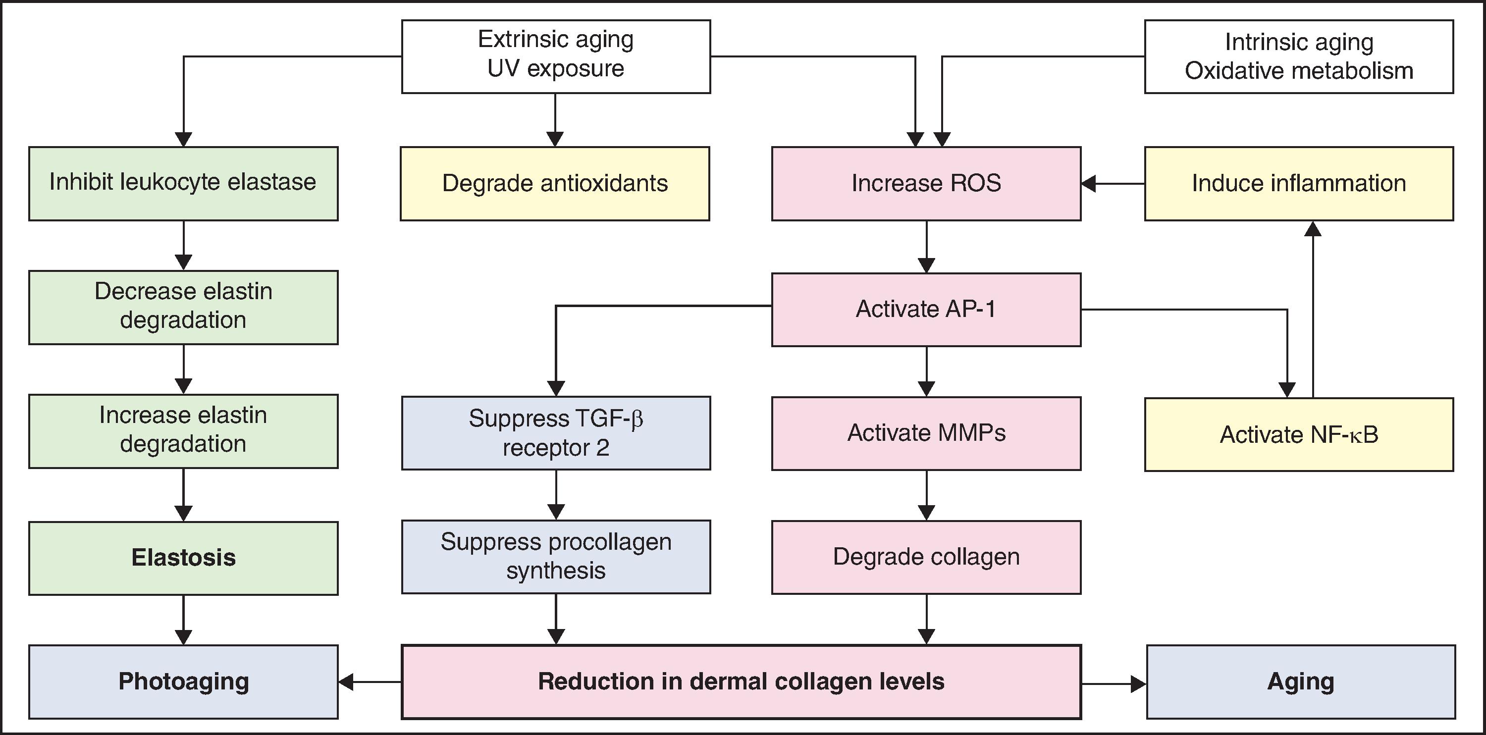 Fig. 16.1 shows a simplified summary of major pathways involved in the aging process. Absorption of solar radiation by chromophores in the skin as well as cellular oxidative metabolism results in the formation of reactive oxygen species (ROS). ROS increase oxidative phosphorylation of cell-surface receptors causing activation of the transcription factor activator protein-1 (AP-1) and nuclear factor-kappa B (NF-κB).