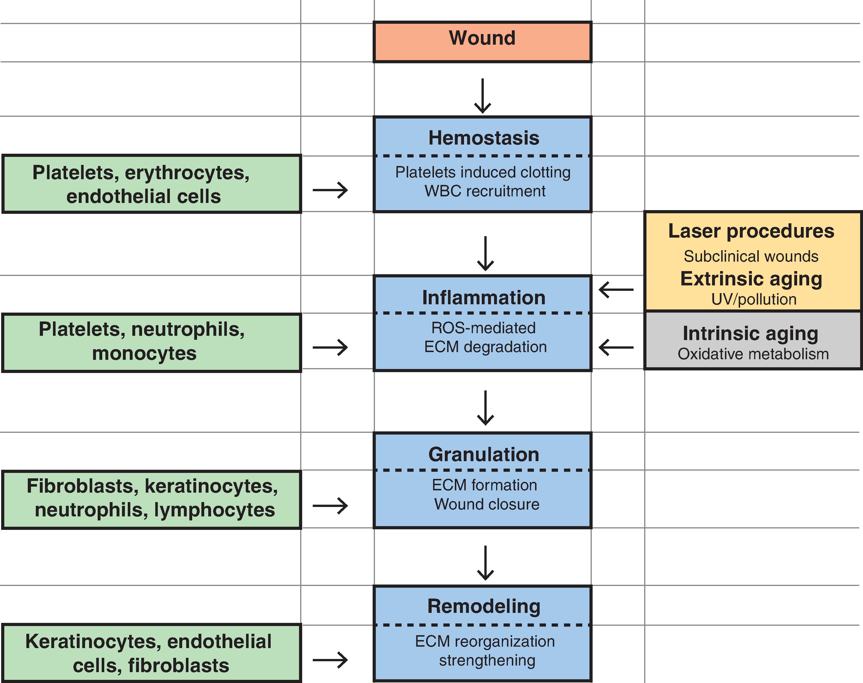 After injury, cytokines and other growth factors flood the wound site to mediate the inflammatory response, promote new cell growth, and decrease wound contraction and scarring. The process of wound healing is commonly divided into four overlapping phases that describe physiologic responses to injury. These phases include hemostasis, inflammation, proliferation, and remodeling. Fig. 16.2 summarizes each phase of wound healing along with the predominant cells involved. During hemostasis, platelets release various cytokines, growth factors, and exosomes at the wound site to promote chemotaxis and mitogenesis. In the inflammatory stage, neutrophils and monocytes migrate to the wound site to initiate phagocytosis and to release their secretome that attract fibroblasts. The proliferation phase is marked by epithelialization, angiogenesis, granular tissue formation, and collagen deposition. During proliferation, keratinocytes restore barrier function to the skin, and its secretome stimulates the expression of new keratin proteins. Fibroblasts produce collagen that is deposited in the wound bed. This cycle of collagen production and growth factor secretion continues in a type of autocrine feedback loop of continuous wound repair.