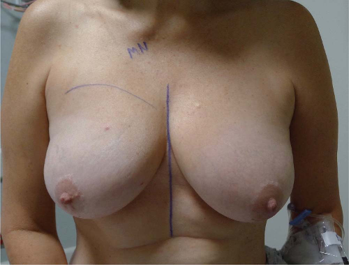 ![]() FIGURE 16-1 Preoperative photograph of a woman with right breast cancer scheduled for unilateral nipple-sparing mastectomy through an inframammary incision. |