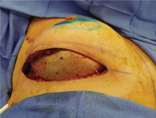 ![]() FIGURE 16-2 Intraoperative photograph demonstrating the inframammary approach with a prepectoral prosthetic device. |