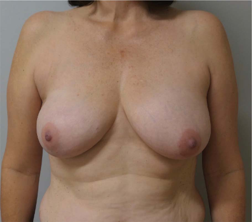 in an elliptical fashion. In the event of a positive NAC margin following the IMF approach for the NSM, excision of the NAC is usually performed vertically, thus creating an inverted T incision. Figures 16-4 to 16-6 illustrate a woman following NSM and postoperative radiation.