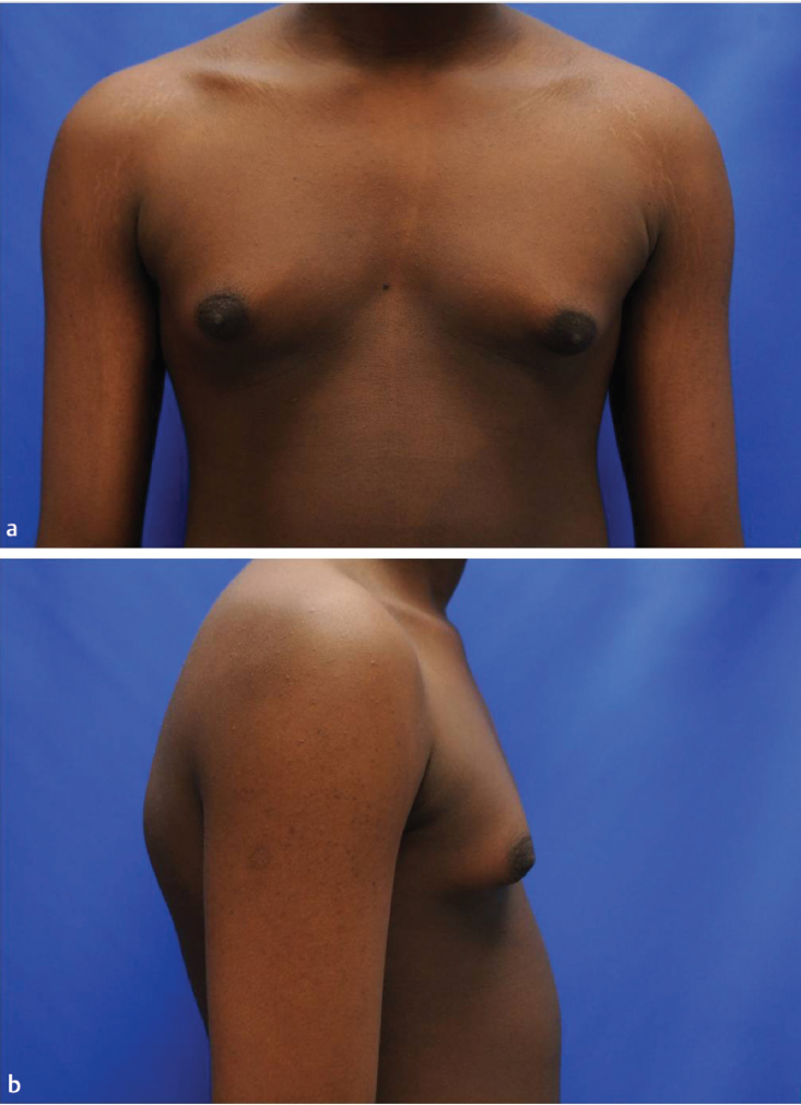 Bilaterally symmetric, mildly enlarged breasts in a male patient.
