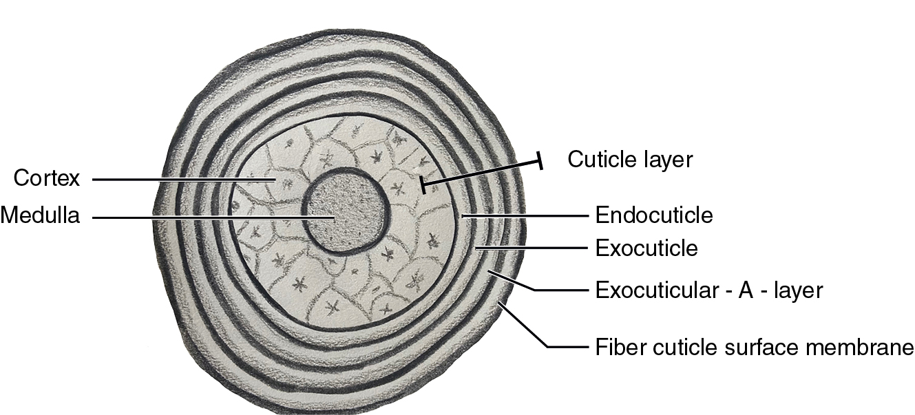 Within the United States in 2021, routine hair and scalp hygiene and styling products were readily available and routinely used in the general population. However, a thorough understanding of hair cosmetics, styling, and processing requires individuals to also understand the concept of weathering. Weathering is a hair shaft process that results in hair damage from root to tip and includes decreased shine, elasticity, and, ultimately, breakage (level of evidence: 5) ( Pearl 5.1 ). , There are two types of weathering: natural and accelerated. In the process of natural weathering, the cuticle is worn away over time from hair brushing, combing, or other physical haircare maintenance techniques. Accelerated weathering includes damage to the hair’s cuticle and cortex proteins ( Fig. 5.1 ). , Those with long hair often demonstrate more severe weathering caused by repetitive injury of the hair shaft over time (level of evidence: 5). Processes that weaken hair fiber integrity and contribute to accelerated weathering include heat styling and chemical processing such as bleaching and permanent waving (level of evidence: 5). , Processes such as straightening, bleaching, and perming alter the protein structures of hair, causing irreversible damage (level of evidence: 5). , Other environmental factors in weathering include prolonged exposure to sunlight, resulting in loss of tensile strength, color changes, embrittlement, and split ends (level of evidence: 5). Sunlight exposure causes proteins and lipids to undergo degradation via a reaction between aromatic amino acid species and ultraviolet light, which produces reactive oxygen species such as hydrogen peroxide, hydroperoxides, and singlet oxygen. Overall, weathering of the hair fiber is expected over time in those with and without hair and scalp disease.