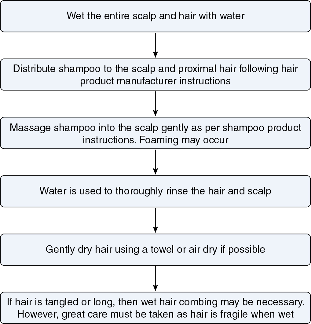 Although shampoo usage is fairly ubiquitous, there can sometimes be confusion surrounding how exactly it should be used. In general, the hair should be wet, then a custom amount of shampoo should be massaged on the scalp and the proximal hair shafts (see Fig. 5.4 ). The shampoo should then be fully rinsed out of the hair and scalp (level of evidence: 5). The amount of shampoo needed may vary between individuals and by scalp size and product type. Shampooing frequency is determined by numerous factors including hair type, hairstyle, sweat-producing activity level, and hairstyling product usage. Individuals with oily hair or fine hair may need to shampoo their hair more often than those with dry hair (level of evidence: 5). Those with curly or dry hair may have more fragile hair shafts susceptible to breakage with frequent shampooing; therefore, some patients may need to limit shampoo-based washing to approximately every 7 to 14 days (level of evidence: 5). , In the authors’ experience, the presence of erythema, pruritus, flakes, or scale on the scalp or proximal hair shaft may indicate that the scalp needs to be washed more often. In general, hair should not be washed more than once a day. Sometimes, patients with hair loss will shampoo their hair more often than necessary to give the appearance of more volume, as sebum can weigh down the hair. Consumers should seek shampoos labeled for their hair type. For example, those that have fine hair should look with shampoo labels for “fine hair.” Those with curly or dry hair should look for labels for “curly,” “dry,” or “very dry” hair. Those with color-treated hair or bleached hair should also look for shampoos labeled for their hair type.