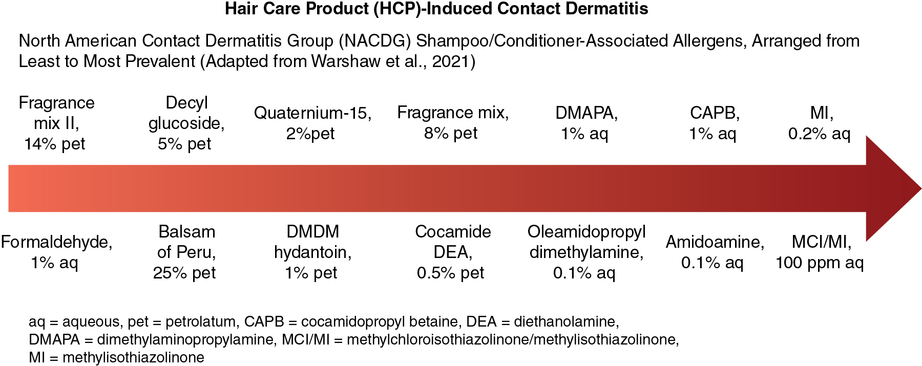 Of note, patients with a history of contact dermatitis may find the hair and scalp cosmetics industry difficult to navigate given the numerous ingredients found in products. Routine patch testing or patch testing within a tertiary care center may be required to finesse product selection (level of evidence: 5). When managing patients with alopecia, physicians must recognize that hair cosmetics, processing, and styling options are unique to each patient as product choices can be affected by hair and scalp disease, hair type, and social determinants of health.