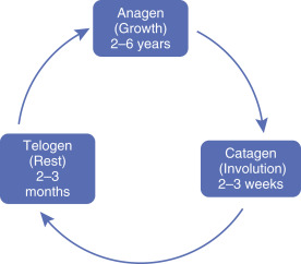 In order to understand the behavior of the hair follicle in the setting of systemic disease, it is first important to appreciate normal follicular biology. At the time of birth, there are approximately 150,000 hair follicles on the scalp. Each undergoes a continuous cyclic pattern of changes (the follicular lifecycle) during the person’s lifetime. The first two cycles of hair growth occur synchronously in utero and then shortly after birth. After that, each follicle seems to have a growth cycle independent of those around it.