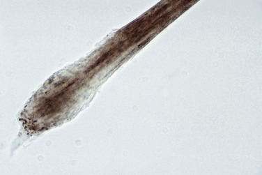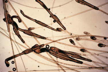 Physical examination of any patient with hair loss should begin with an overall inspection of the patient’s hair density. The scalp of a patient with telogen effluvium should appear within normal limits, without erythema or scale (unless there is a secondary diagnosis). A hair pull test, in which 25 to 50 hairs are pulled with firm and consistent traction from root to tip, should be done in four quadrants. Patients with telogen effluvium will have a positive result, i.e., more than three hair shafts, the roots of which show the depigmented, keratinized, clubbed morphology of telogen hairs ( Fig. 43-3 ). The patient should not have shampooed for at least one day prior to the hair pull test. A forcible hair pluck extracts a mixture of normal anagen and telogen hairs and an occasional catagen hair. The percentage of telogen hairs is increased, a criterion without which the diagnosis of telogen effluvium cannot be established with certainty ( Fig. 43-4 ). On biopsy, a 4-mm scalp punch specimen should contain 25 to 50 terminal follicles. When more than 12% to 15% of hairs are in telogen, a diagnosis of telogen effluvium is likely.
