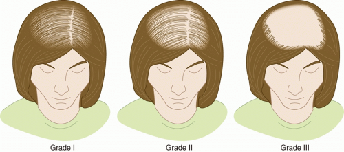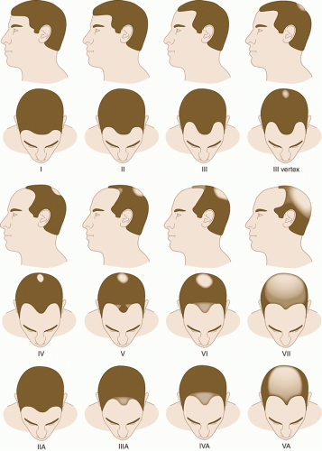 Androgen-dependent hair loss is well established in men and typically presents with gradual thinning of hairs in the vertex scalp along with recession of the frontotemporal hairline. Typically, the occipital and parietal scalp remain unaffected. Classically, the Hamilton-Norwood scale (Figure 6.1) is utilized to describe the severity of MPHL.