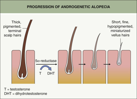 Miniaturization of terminal pigmented anagen hairs to fine hypopigmented vellus hairs is the hallmark of androgenetic alopecia (AGA; Fig. 157.1 ). Androgens, in particular testosterone and dihydrotestosterone (DHT), are required for the progressive reduction in hair follicle size with each cycle. The enzyme 5α-reductase, which is inhibited by drugs such as finasteride, converts testosterone to DHT (see Fig. 69.10 ). In addition to 5α-reductase isoenzymes (see Fig. 69.3 ), multiple androgen-metabolizing enzymes actually reside within the hair follicle itself, providing an explanation for “end-organ” sensitivity (see Fig. 69.4 ).