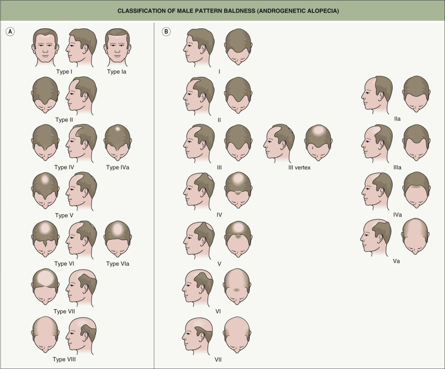 Classification of male pattern baldness (androgenetic alopecia).