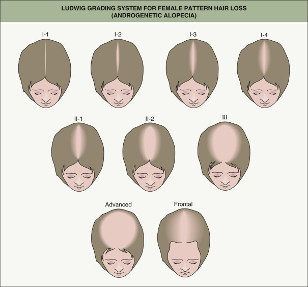 There are grading systems for androgenetic alopecia that allow assessment of severity, progression and response to therapy. In men, the Norwood classification ( Fig. 157.2 ) is used more often than the Hamilton classification system. Patterned hair loss in women is classically given a Ludwig grade (I, II or III; Fig. 157.3 ), even though the hair loss often has a Christmas tree pattern. Occasionally, the classification scheme for men is used.