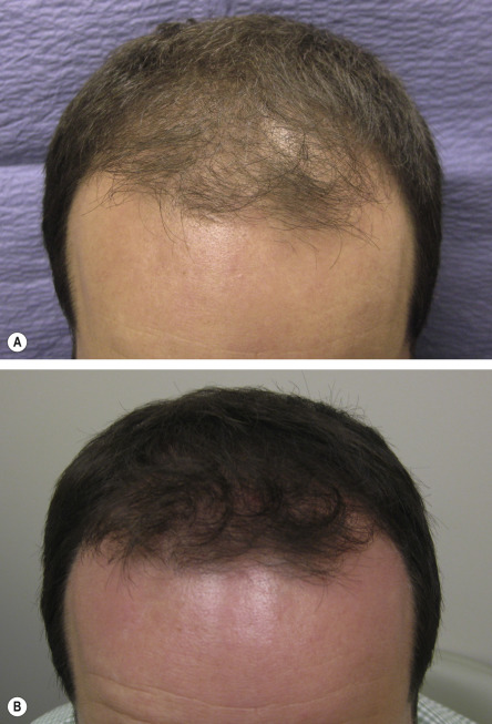 A 38-year-old man with male pattern hair loss (baseline). B Appearance following 1 year of finasteride plus hair transplantation (500 grafts).