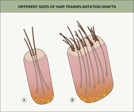 A The newer technique uses 1- to 4-hair follicular unit grafts. B The older technique uses larger 10- to 15-hair grafts.