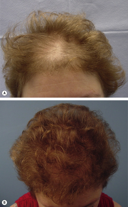 A Ludwig II pattern (baseline). B Appearance following transplantation of 750 hair grafts, each with one to three hairs.