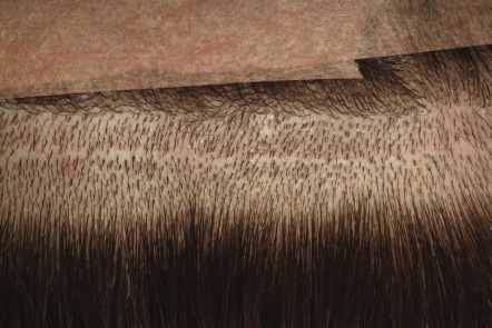 Patients have to realize that elliptical donor harvesting will lead to a permanent scar of the posterior scalp ( Fig. 157.8 ). The scar is of no practical concern unless the patient has his or her hair closely cut. If the patient expresses an interest in having closely cropped hair, follicular unit extraction (FUE) should be considered (see below). However, the possibility of small “white dots” following FUE should be discussed. Lastly, the patient must appreciate the need for a conservative approach to placement of the anterior hairline so that it will have a natural appearance over a lifetime.