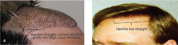 Fig. 40.2 Unnatural transplanted hairline. (a) Hairline is too straight, grafts are misdirected, and the frontotemporal angle has been abnormally filled in. (b) Unnaturally transplanted hairline. Hairline too straight with no irregularity, even thoughonly one-hair follicular unit (FU) grafts were used.