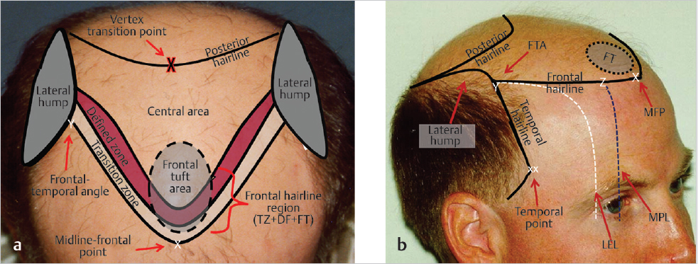 Keywords: hairline naturalness transition zone defined zone lateral hump frontal tuft frontotemporal angle cowlick lateral epicanthal line temporal point